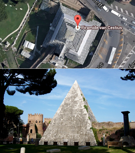 Hier naast zie je de piramide van Cestius, deze piramide ligt in Rome (Italie). De piramide werdt in 330 dagen gebouwd en is 36 meter hoog en 29,5 meter breedt. De piramide is gemaakt van cement en baksteen, omdat hij van cement en baksteen was heeft hij een scherpere hoek dan de piramides in Egypte. Caius Cestius werd in 12 v.C. begraven in deze piramide.